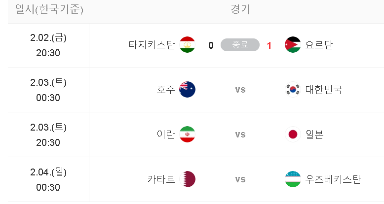 아시안컵 호주와 대한민국 경기 일정은 2월 3일 토요일 00시 30분입니다. 00시 10분부터 시청을 하시면 됩니다.