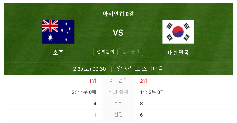 1. 아시안컵 호주 대한민국 8강전 시간 및 역대전적